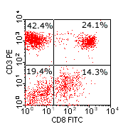 Flow cytometry data analysis. Left-hand plot show a one-colour histogram plot of CD8 expression by peripheral blood lymphocytes. Approximately 38% of events fall between the marker boundaries, and are therefore regarded as CD8 +ve. The centre plot also shows CD8 expression on PB lymphocytes, but depicts the relationship between CD8 and the T-cell marker CD3. It is apparent that the CD8 +ve population depicted by the histogram contains two CD3-defined sub-populations (CD3+ve and CD3-ve), and that the CD3-ve fraction (lower right quadrant) expresses CD8 at a lower intensity than the CD3+ve fraction (upper right quadrant). The right-hand plot shows a population of CD34 +ve 'stem cells' plotted against side scatter. |