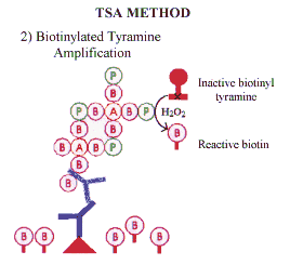 | The use of biotinylated tyramide to amplify immunocytochemical reactions on tissue sections was first described by Adams et al [2]. The technique requires appropriate pre-treatment procedures and optimal antigen retrieval, and follows a conventional ABC method. After the initial StrABC/HRP layer the biotinylated tyramide step is performed. | ![]() |