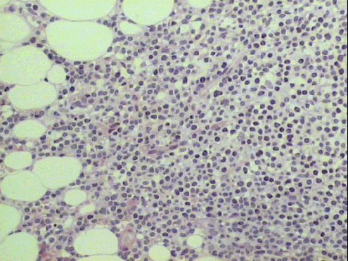 Bone marrow trephine biopsy showing infiltration by Mantle Cell Lymphoma cells.
